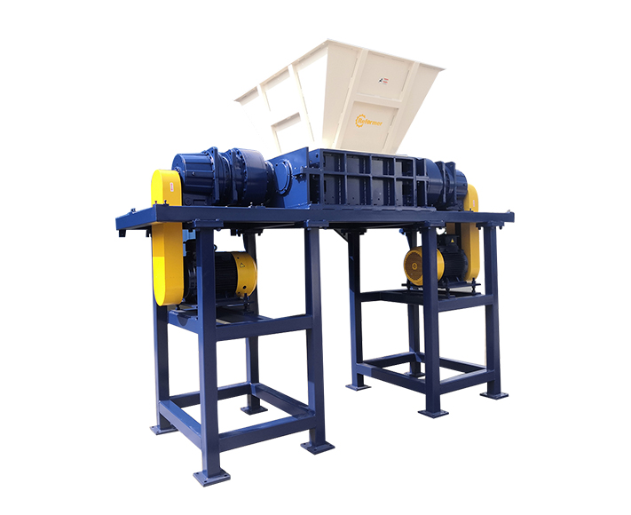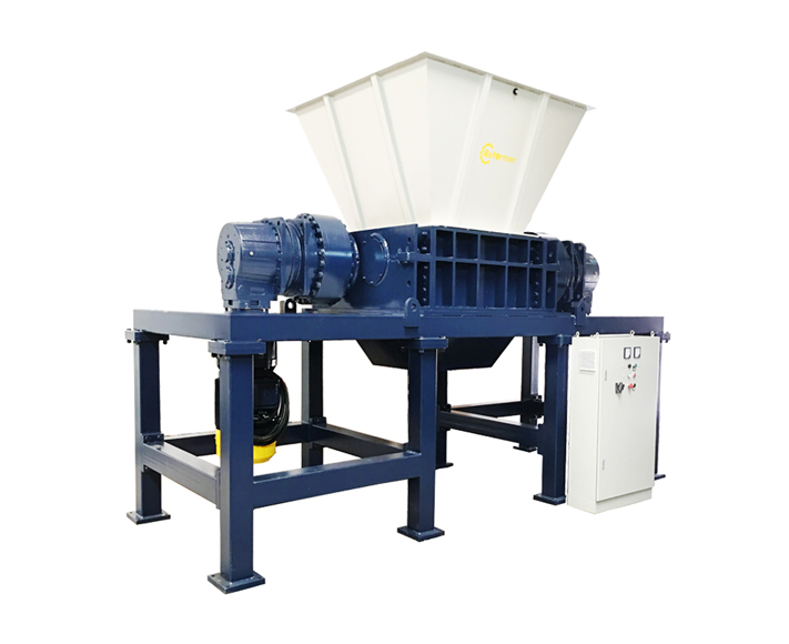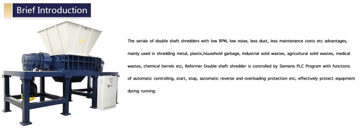 Double shaft shredders with low RPM, low noise, less dust, less maintenance costs etc advantages, mainly used in shredding metal, plastic, household garbage, Industrial solid wastes, agricultural solid wastes, medical wastes, chemical barrels etc. is controlled by Siemens PLC Program with functions of automatic controlling, start, stop, automatic reverse etc.