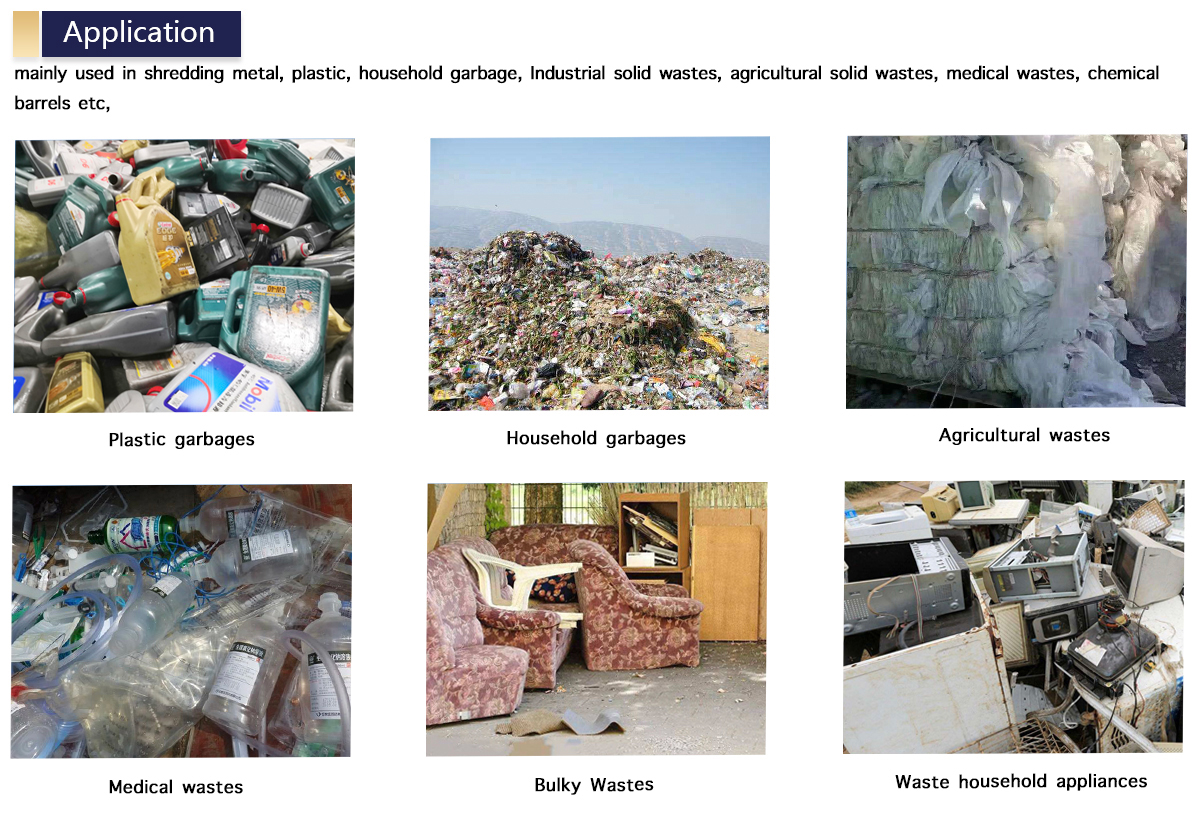 Mainly used for crushing metal, plastic, domestic garbage, industrial solid waste, agricultural solid waste, medical waste, chemical barrels, etc.