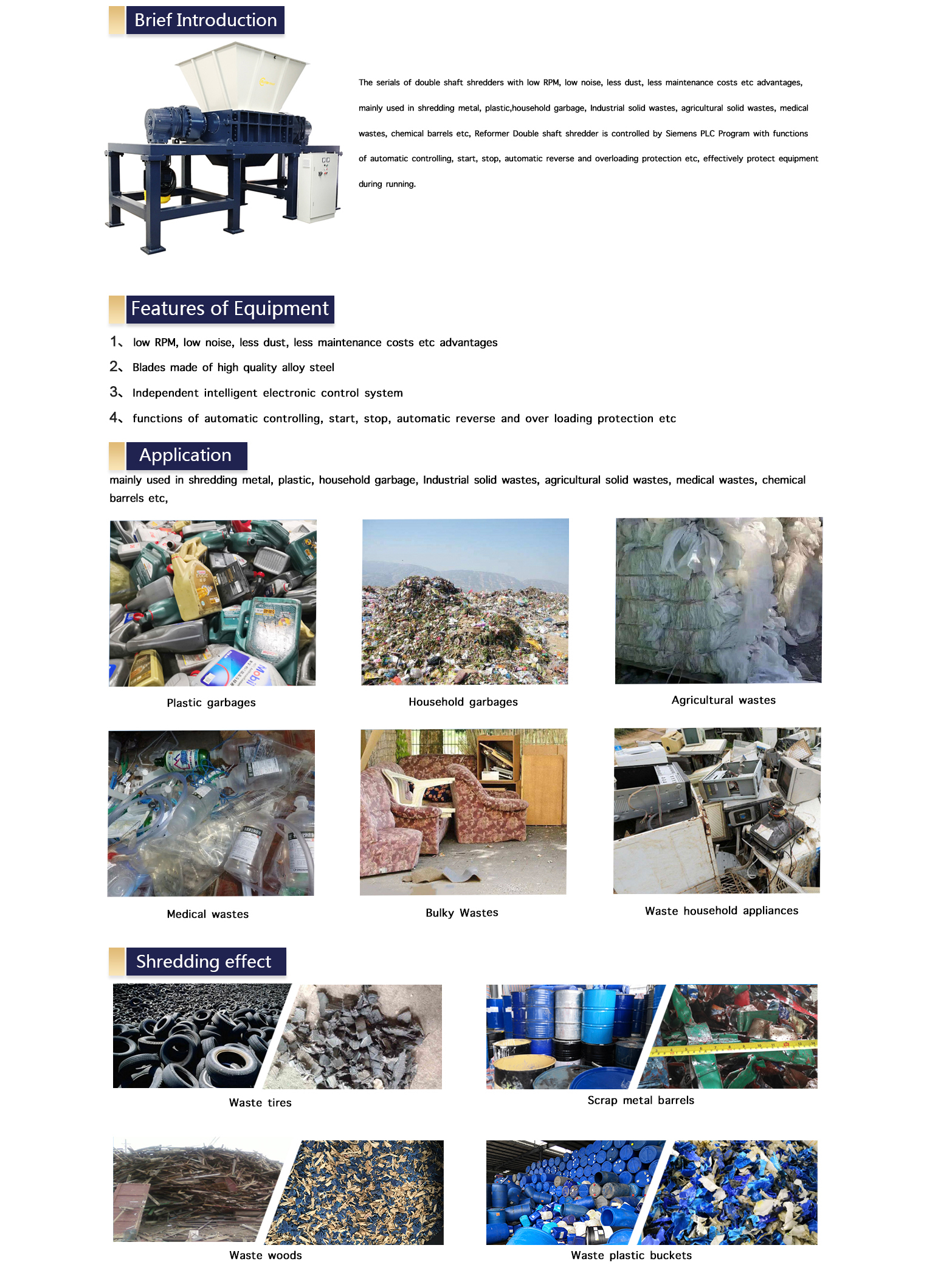 Double shaft shredders with low RPM, low noise, less dust, less maintenance costs etc advantages, mainly used in shredding metal, plastic, household garbage, Industrial solid wastes, agricultural solid wastes, medical wastes, chemical barrels etc. is controlled by Siemens PLC Program with functions of automatic controlling, start, stop, automatic reverse etc.