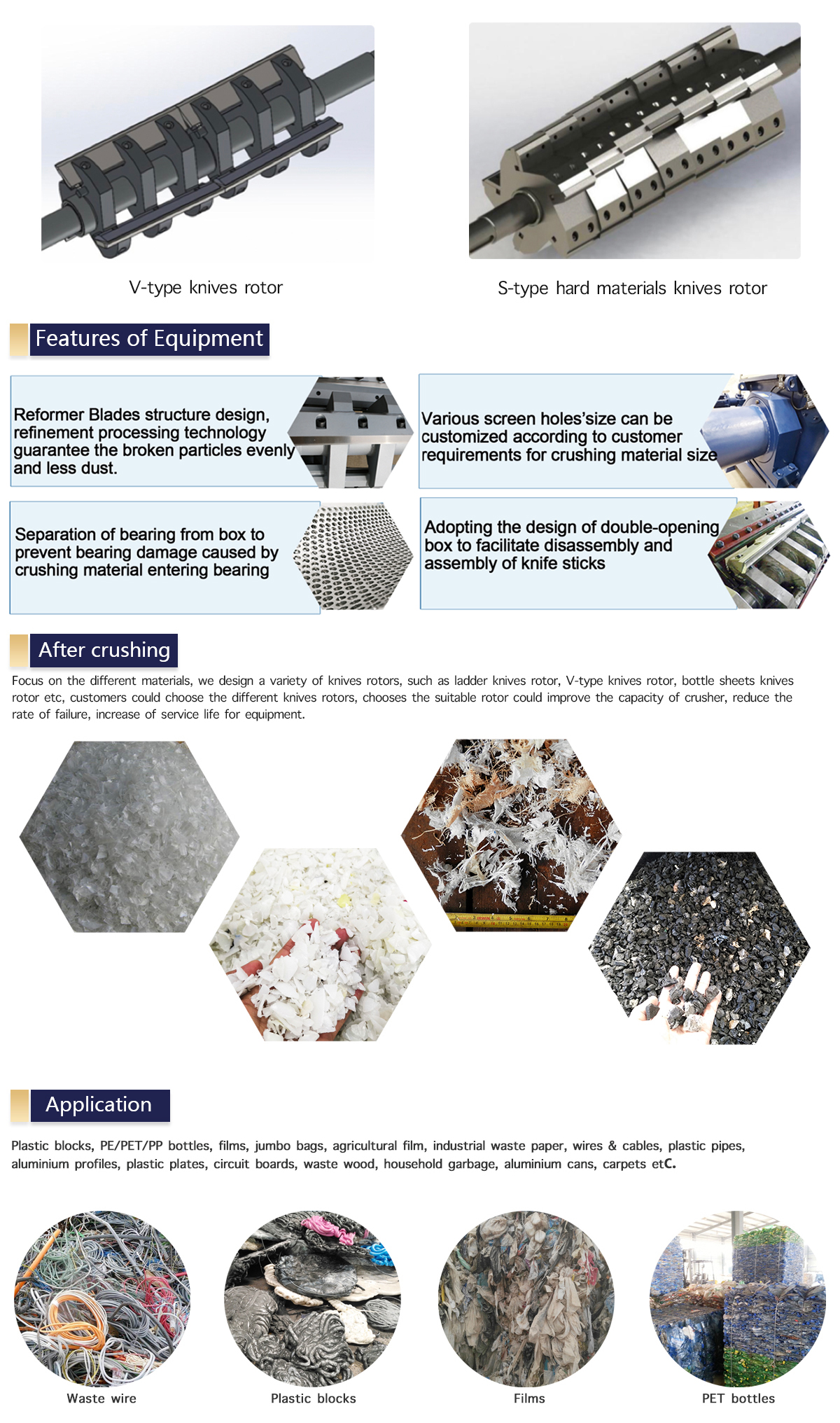 The crushers serials mainly used in crushing smaller input materials, such as plastics, wood, paper, films & rubber etc, especially as for the secondary cutting for getting the much smaller output size.